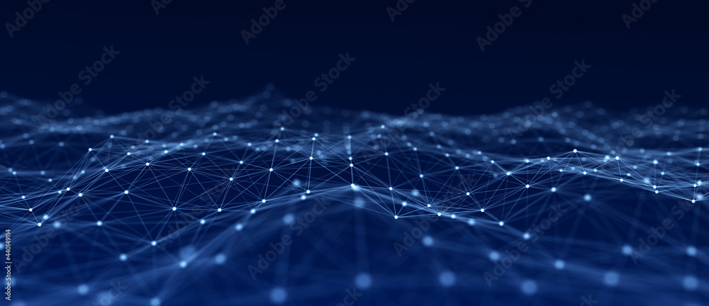 Wall mural : Abstract wave with moving dots and lines - flow of particles - cyber technology illustration - 3d rende