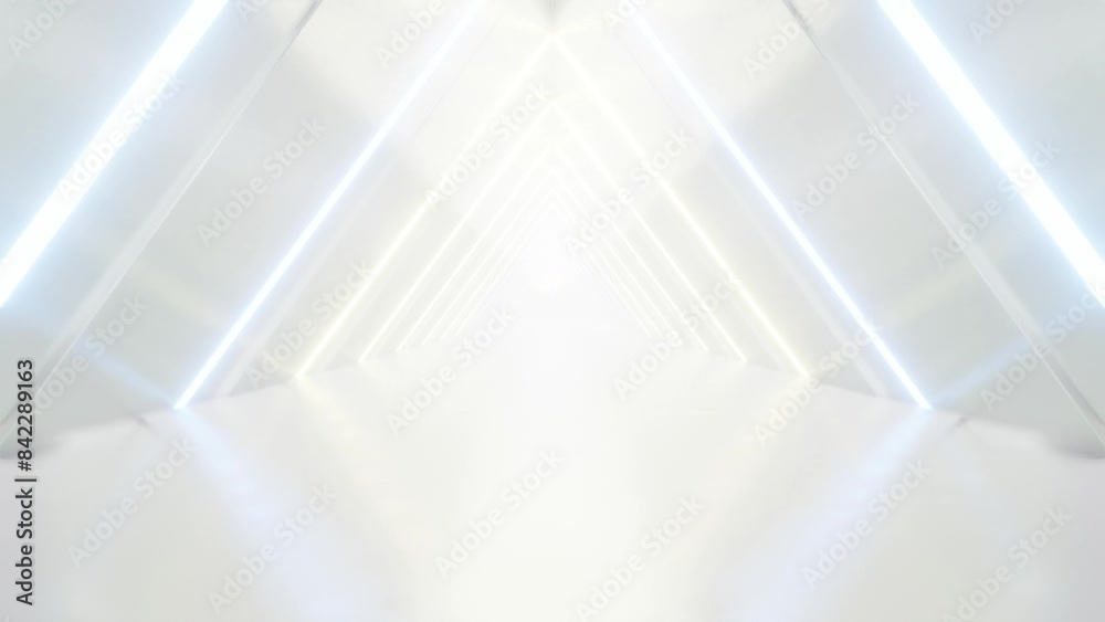 Wall mural : Abstract white futuristic triangle tunnel architecture with neon light, loop animation -