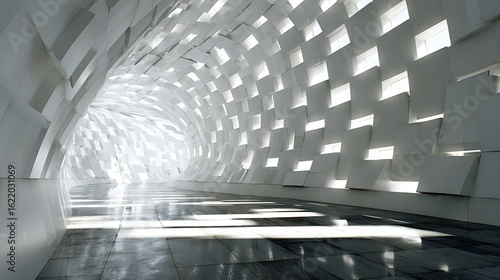 The watermark will not be included on Wall mural.: Abstract white tunnel with geometric pattern and bright light, creating a futuristic and modern arch