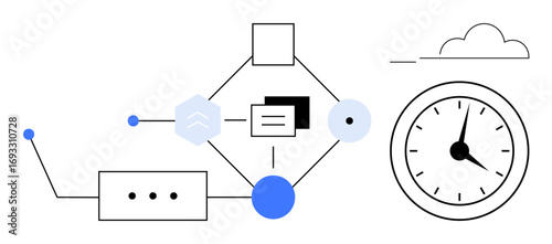 Wall mural : Abstract workflow diagram with shapes, icons, and lines illustrating process flow, cloud connectivit