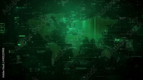 Wall mural abstract world map formed by glowing green pixels on a dark background with digital data overlay. - Wall murals Wall mural abstract world map formed by glowing green pixels on a dark background with digital data overlay. - Wall murals