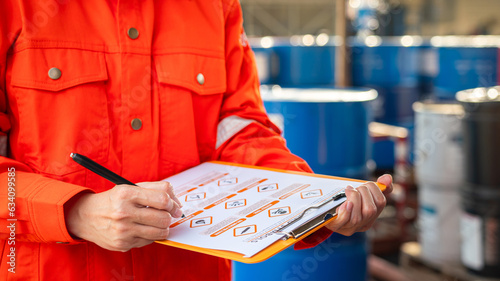 Wall mural : Action of safety officer is using a pen to checking on the hazadous material symbol label form with