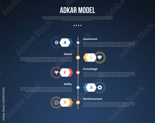 Wall mural : Adkar model infographic template with vertical timeline and outline circle dark background style wit
