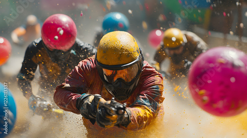 The watermark will not be included on Wall mural.: Adrenaline chase: paintball players strategically duck behind obstacles in intense game of skill and