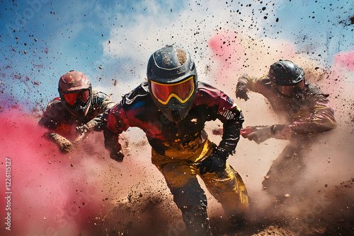 Wall mural adrenaline chase: paintball players strategically duck behind obstacles in intense game of skill and - Wall murals Wall mural adrenaline chase: paintball players strategically duck behind obstacles in intense game of skill and - Wall murals