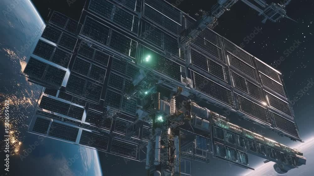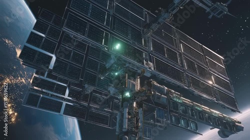 Wall mural advanced space station with expansive solar panels gliding through low earth orbit, displaying soft