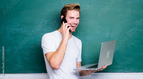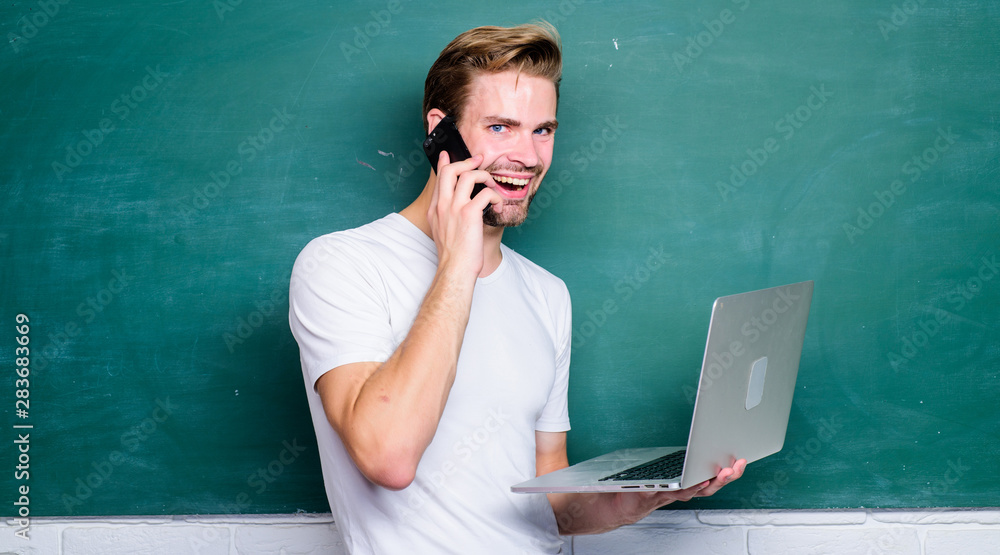 Advantage mobile internet - handsome man use modern technologies - digital concept - online communicatiWall mural