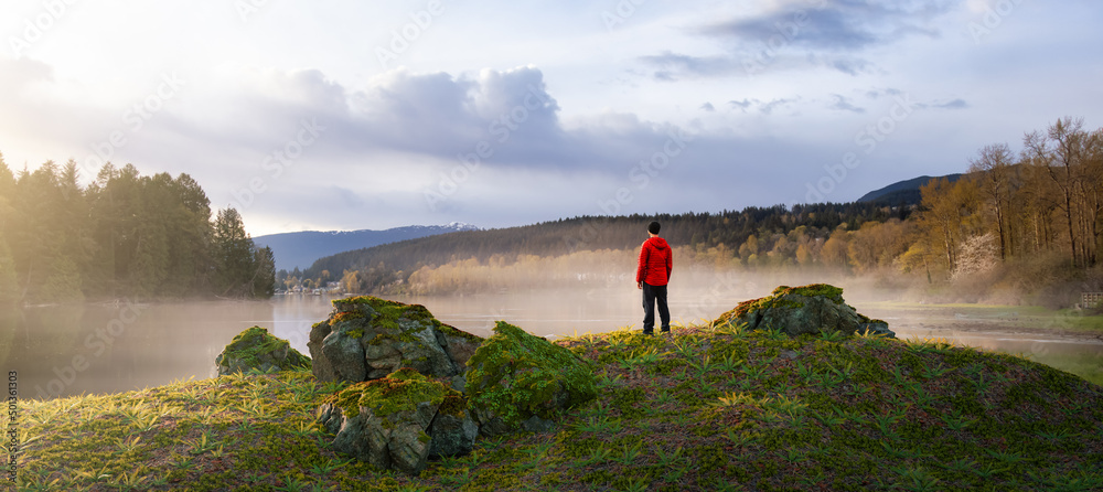 Wall mural adventurous man standing in nature. cloudy sunset sky. 3d rendering shore with background image from
