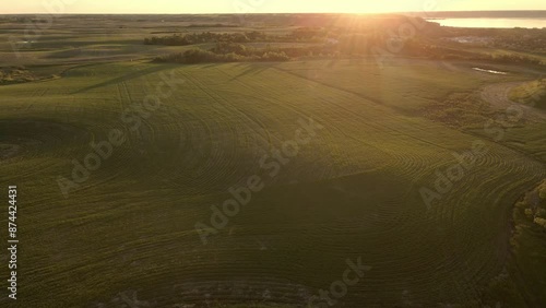 The watermark will not be included on Wall mural.: Aerial drone view of an agricultural landscape at sunset - the drone is moving forward and looking di