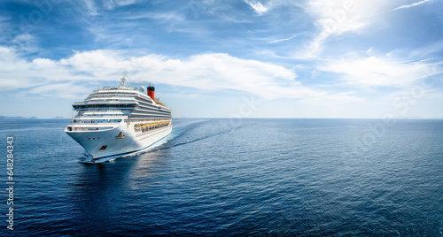 Wall mural : Aerial front view of a generic cruise ship traveling with speed over blue ocean with copy space
