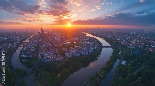 Wall mural aerial panoramic view of frankfurt at sunset with vibrant clouds and illuminated city skyline along