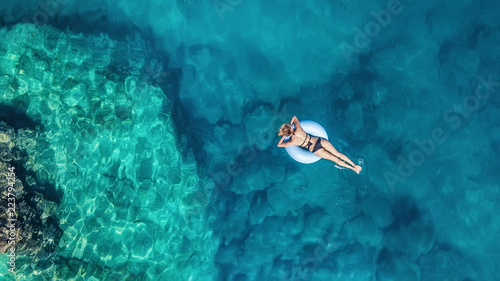 Wall mural aerial view at the girl on sea. turquoise water from air as a background from air. natural seascape