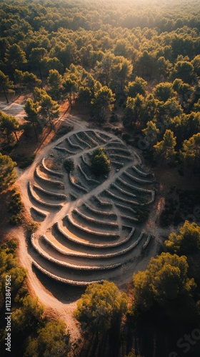 Wall mural aerial view of a circular pattern in a forest, likely an ancient structure or ceremonial site. - Wall murals Wall mural aerial view of a circular pattern in a forest, likely an ancient structure or ceremonial site. - Wall murals
