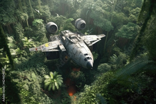 The watermark will not be included on Wall mural.: Aerial view of a dilapidated spacecraft in a jungle clearing, created with generative ai