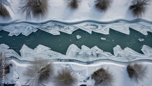 The watermark will not be included on Wall mural.: Aerial view of a frozen river surrounded by snow showcasing intricate ice formations and patterns in