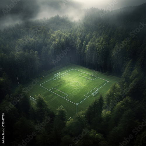 Wall mural : Aerial view of a soccer field in a foggy forest -