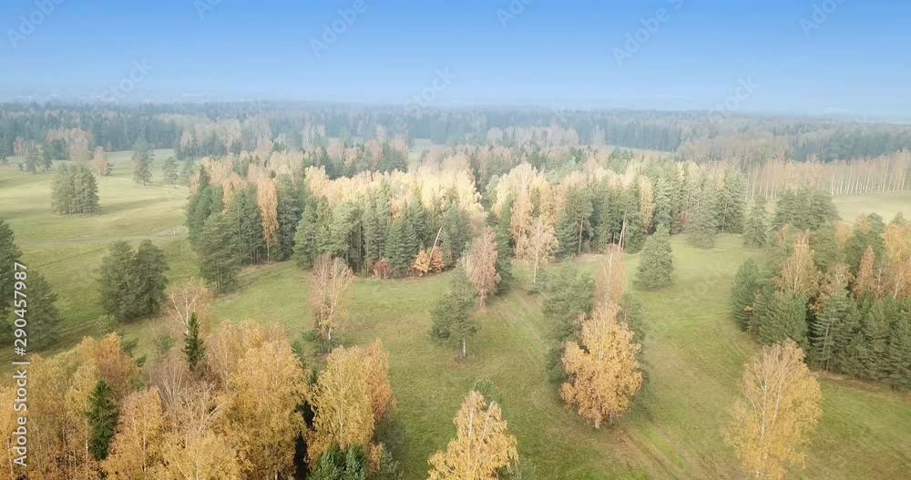 Wall mural aerial view of autumn forest. fall landscape with red, yellow and green trees and fields with a mowe