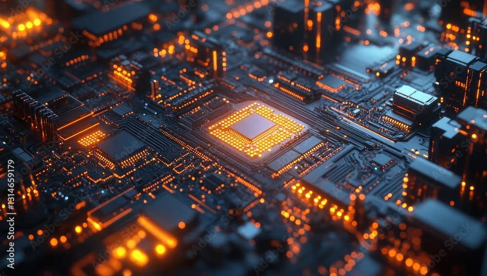 Wall mural aerial view of futuristic computer circuit board with glowing connections and orange led lights high