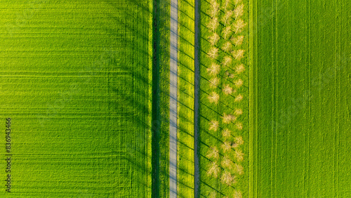 The watermark will not be included on Wall mural.: Aerial view of the field, trees and road - landscape from a drone - light and shadow - natural backgrou