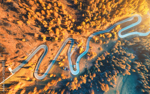 Wall mural aerial view of winding road in autumn forest at sunset in mountains. top view of beautiful asphalt r