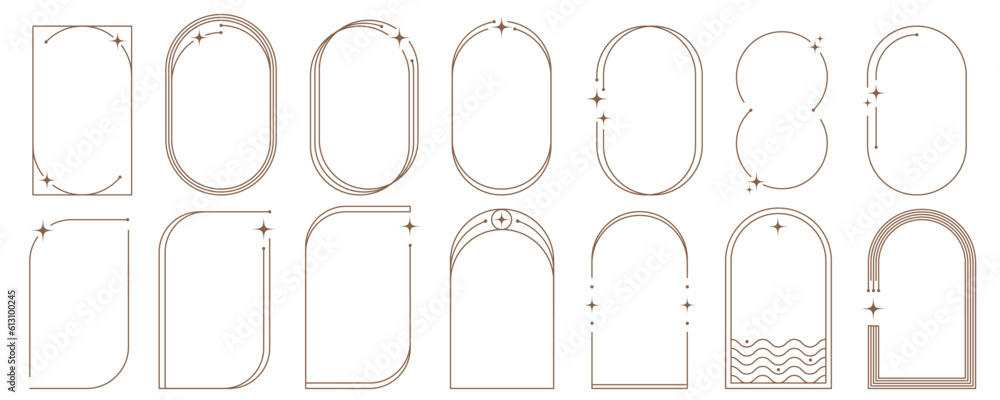 Wall mural aesthetic frame shape. outline minimal graphic elements with stars. abstract boho arches with sparkl