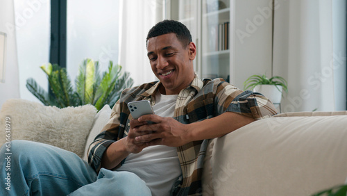 Wall mural african american guy ethnic happy smiling man relaxing on comfortable couch sofa at home using mobil
