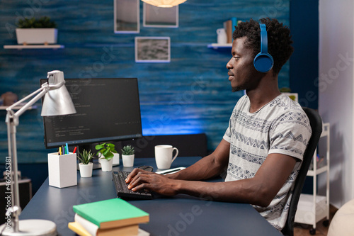 Wall mural african american it employee with headset working remote from home at website design using programmi