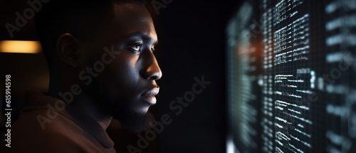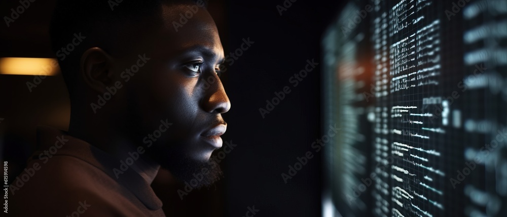 Wall mural african american man programmer looking at lines of code on a screen. generative ai - Wall murals Wall mural african american man programmer looking at lines of code on a screen. generative ai - Wall murals