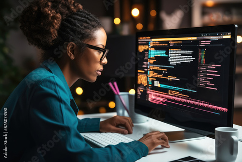 Wall mural african american woman programing developer checking website design in coder network information at  - Wall murals Wall mural african american woman programing developer checking website design in coder network information at - Wall murals