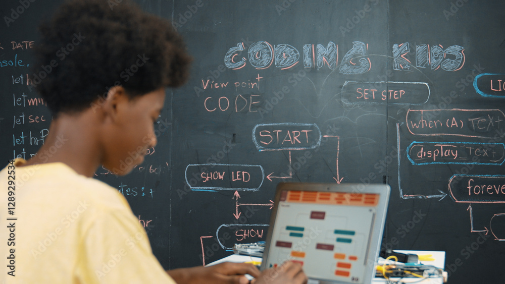The watermark will not be included on Wall mural.: African boy using laptop programing system or coding prompt at blackboard with science theory - highs