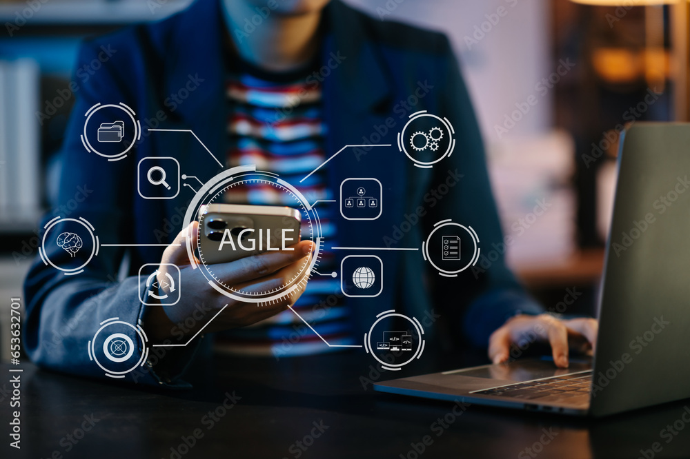 Wall mural agile development methodology concept. business hand using laptop computer and tablet with virtual s