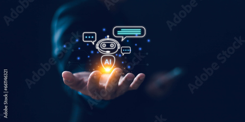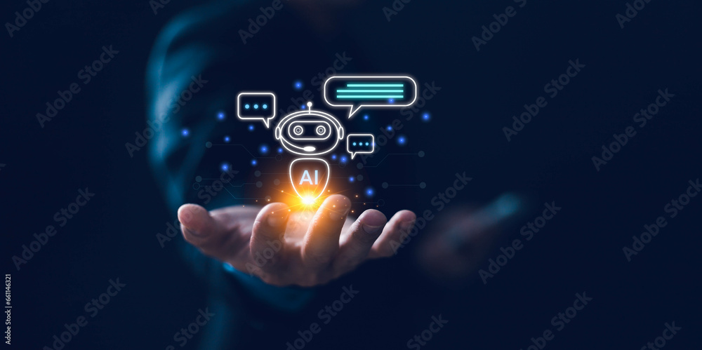Wall mural ai chatbot, artificial intelligence tech chatbot, automated robot assistant technology, businessman  - Wall murals Wall mural ai chatbot, artificial intelligence tech chatbot, automated robot assistant technology, businessman - Wall murals