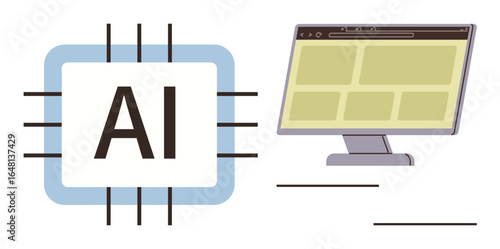Wall mural ai chip with circuits next to a monitor screen with grid layout. ideal for data analysis, ai, comput