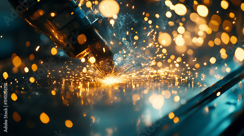 Wall mural ai cnc automatic machine laser welding metal sheet with sparks and bokeh light in factory - Wall murals Wall mural ai cnc automatic machine laser welding metal sheet with sparks and bokeh light in factory - Wall murals