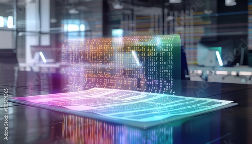 Wall mural ai document analysis futuristic office. holographic document displays colorful binary code cascading - Wall murals Wall mural ai document analysis futuristic office. holographic document displays colorful binary code cascading - Wall murals