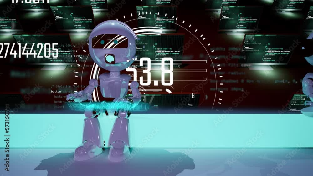 The watermark will not be included on Wall mural.: Ai robot siting on neon light with blackbackground and hud interface graphic show in front - chatbot