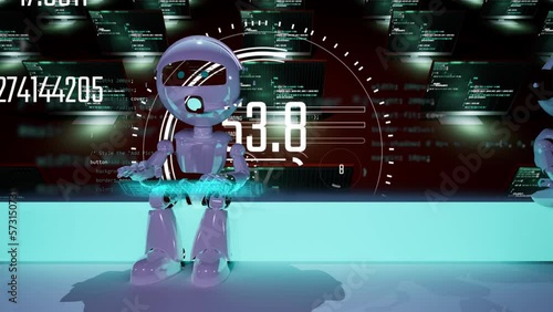 Ai robot siting on neon light with blackbackground and hud interface graphic show in front - chatbot Wall mural