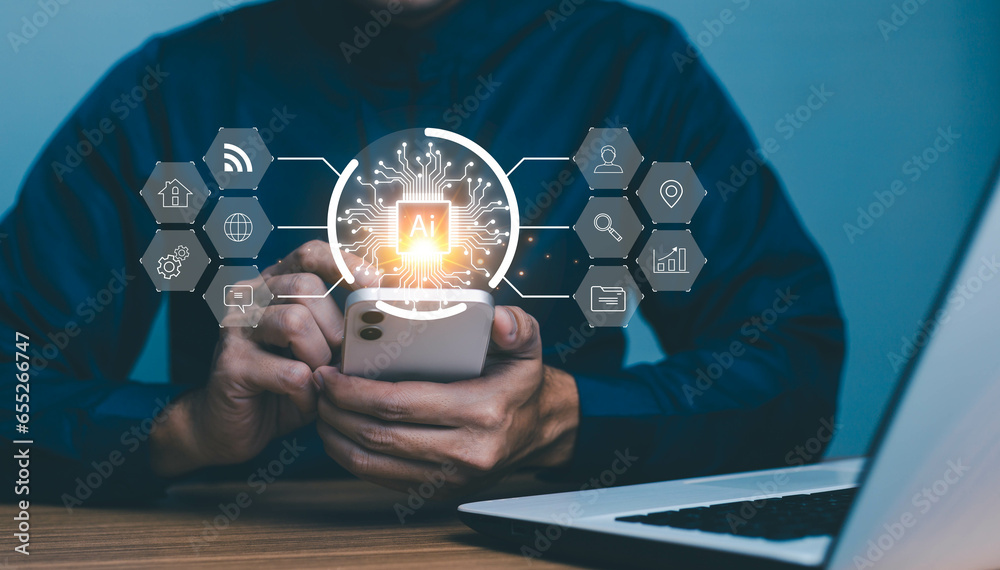 Wall mural ai tech, businessman using smart phone technology internet connect chat with ai, artificial intellig - Wall murals Wall mural ai tech, businessman using smart phone technology internet connect chat with ai, artificial intellig - Wall murals