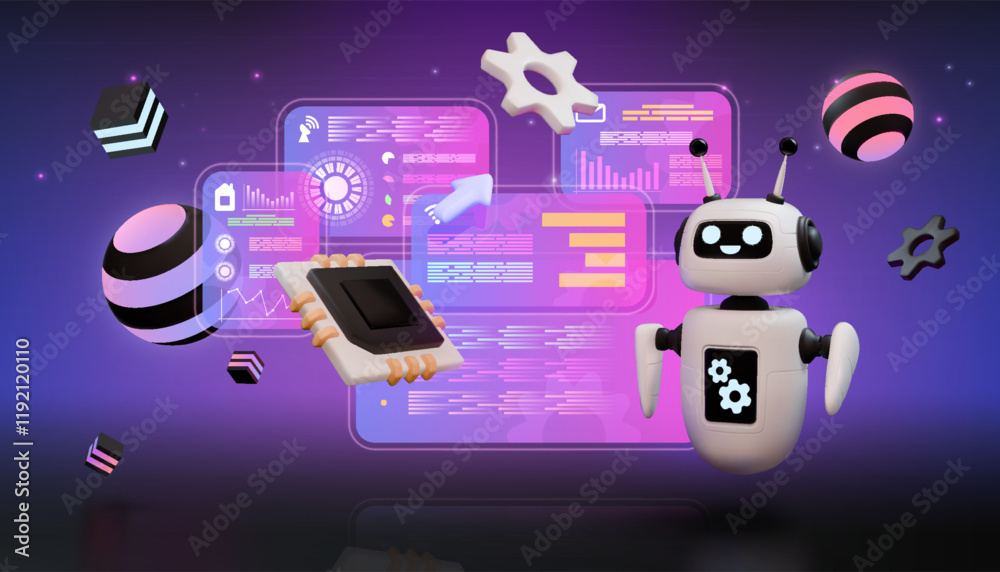 Wall mural ai technology. 3d futuristic robot. digital hud data text or software bot. tech programming. compute