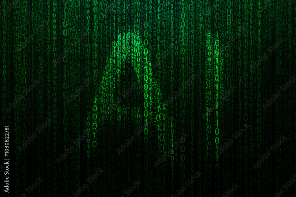 The watermark will not be included on Wall mural.: Ai with flying binary green code, creative background - programming and artificial intelligence