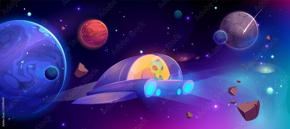 Wall mural alien in spaceship flying in cosmos between planets. vector cartoon futuristic illustration of ufo r - Wall murals Wall mural alien in spaceship flying in cosmos between planets. vector cartoon futuristic illustration of ufo r - Wall murals