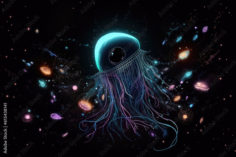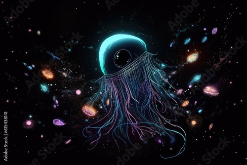 Wall mural alien life form floating through the void of space, surrounded by stars and planets, created with ge