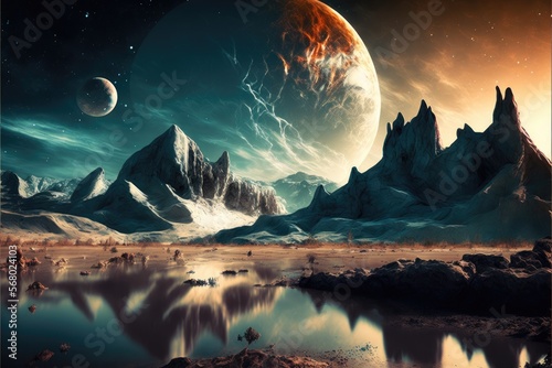 The watermark will not be included on Wall mural.: Alien planet sci-fi outer space encounter wallpaper generative ai illustration with copy space