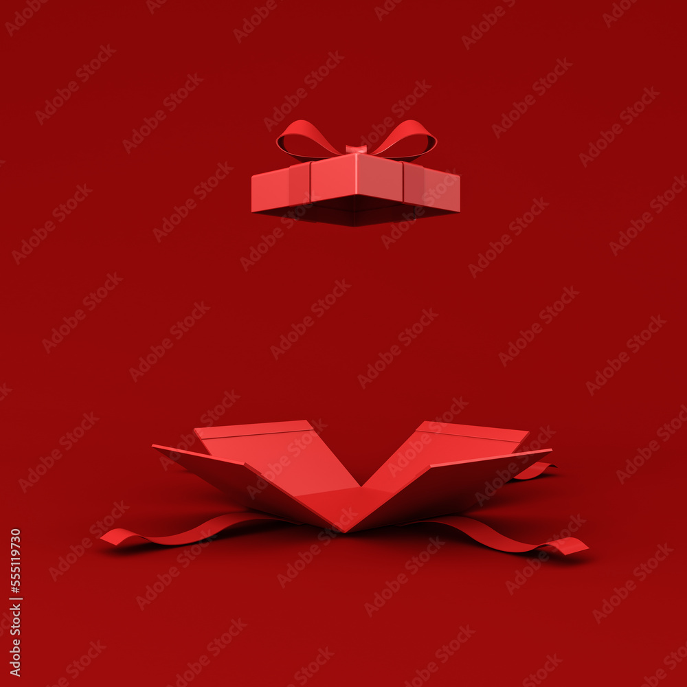 Wall mural all red opening gift box blank opened present box with red ribbon bow isolated on dark red backgroun - Wall murals Wall mural all red opening gift box blank opened present box with red ribbon bow isolated on dark red backgroun - Wall murals