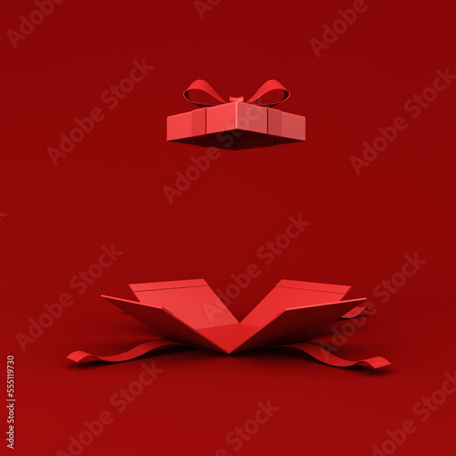 Wall mural : All red opening gift box blank opened present box with red ribbon bow isolated on dark red backgroun