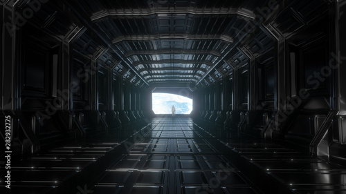 Wall mural : Alone astronaut in futuristic space corridor - view of the earth - 3d rendering