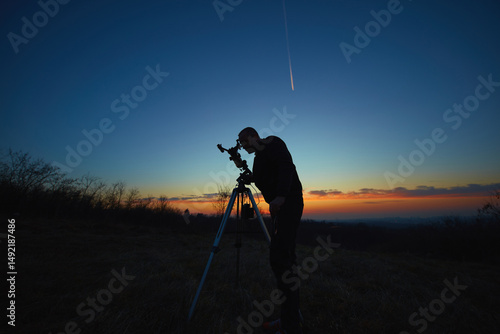 Wall mural amateur astronomer using telescope for watching stars, moon, planets and other celestial objects fro - Wall murals Wall mural amateur astronomer using telescope for watching stars, moon, planets and other celestial objects fro - Wall murals
