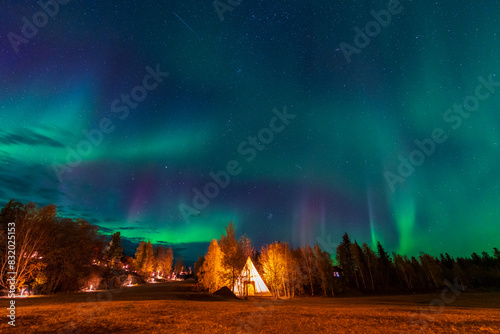 Amazing northern lights dancing over the light up tipi or tepees at aurora village in yellowknife, nWall mural