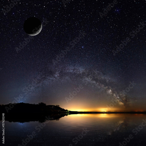 Wall mural amazing panoramic landscape view of a milky way. milky way over the lake.
