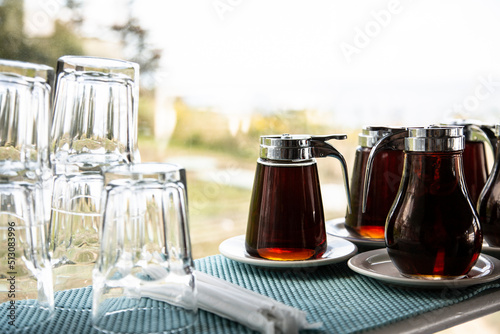Amber maple syrup in glass serving dispensers on saucers next to glassware by a window - Wall mural